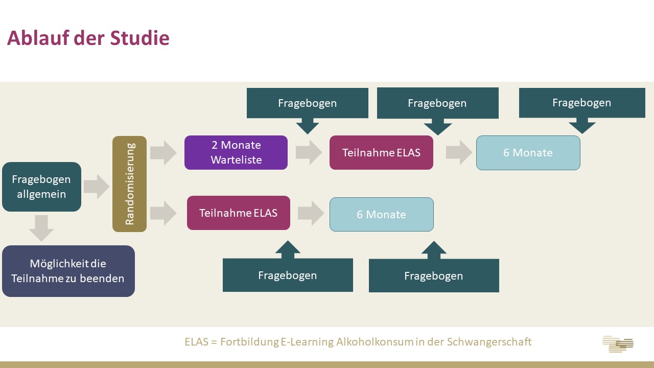 Das Studiendesign sieht eine Aufteilung in zwei Gruppen vor: die Teilnehmer:innen werden entweder der startenden Gruppe zugeteilt und können direkt mit der Bearbeitung der Fortbildung beginnen oder sie werden der Wartegruppe zugeteilt. Teilnehmende der Wartegruppe erhalten nach 2 Monaten erneut einen kurzen Fragebogen (Bearbeitungsdauer ca. 5 Minuten) und können dann mit der Fortbildung starten. Falls Kolleg:innen ebenfalls an der Studie teilnehmen und schon Zugang zur Fortbildung haben, möchten wir die Teilnehmenden der Wartegruppe dennoch bitten, während der Wartezeit keine Inhalte der Fortbildung anzusehen. Für die Bearbeitung der Fortbildung haben die Teilnehmer 28 Tage Zeit nach erstmaliger Registrierung. In diesem Zeitraum können die Teilnehmenden frei entscheiden, wann sie die Inhalte bearbeiten. Die komplette Bearbeitungsdauer der Fortbildung inklusive Abschlussprüfung beträgt in etwa 8 Stunden. Nach Abschluss der Fortbildung werden die Teilnehmenden nochmal gebeten, ein paar Fragen zu beantworten (Bearbeitungsdauer ca. 5 Minuten). Danach erhalten sie ihr Zertifikat und 10 Fortbildungspunkte. Nach 6 Monaten werden wir die Teilnehmenden erneut bitten, sich nochmals ca. 5 Minuten für die Studie Zeit zu nehmen und die Fragen, die auch schon nach Abschluss der Fortbildung gestellt wurden, zu beantworten, damit wir die Wirksamkeit unseres E-Learning-Angebots überprüfen und gegebenenfalls verbessern können.